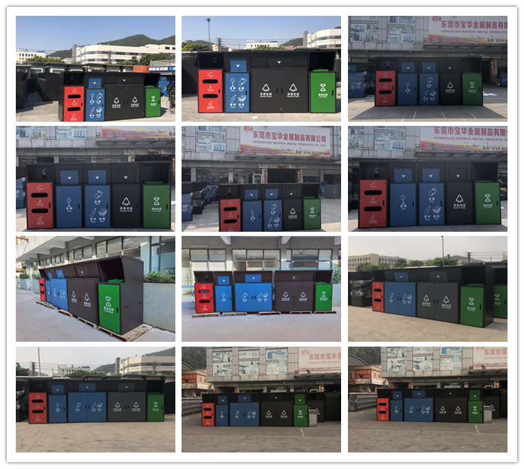1、鐵制五分類垃圾桶身用1.2mm厚,門用1.5mm厚鍍鋅鋼板經(jīng)激光切割、剪、折、彎等精加工鈑金工藝制作成型,表面經(jīng)靜電噴涂專用戶外粉高溫烘烤而成。